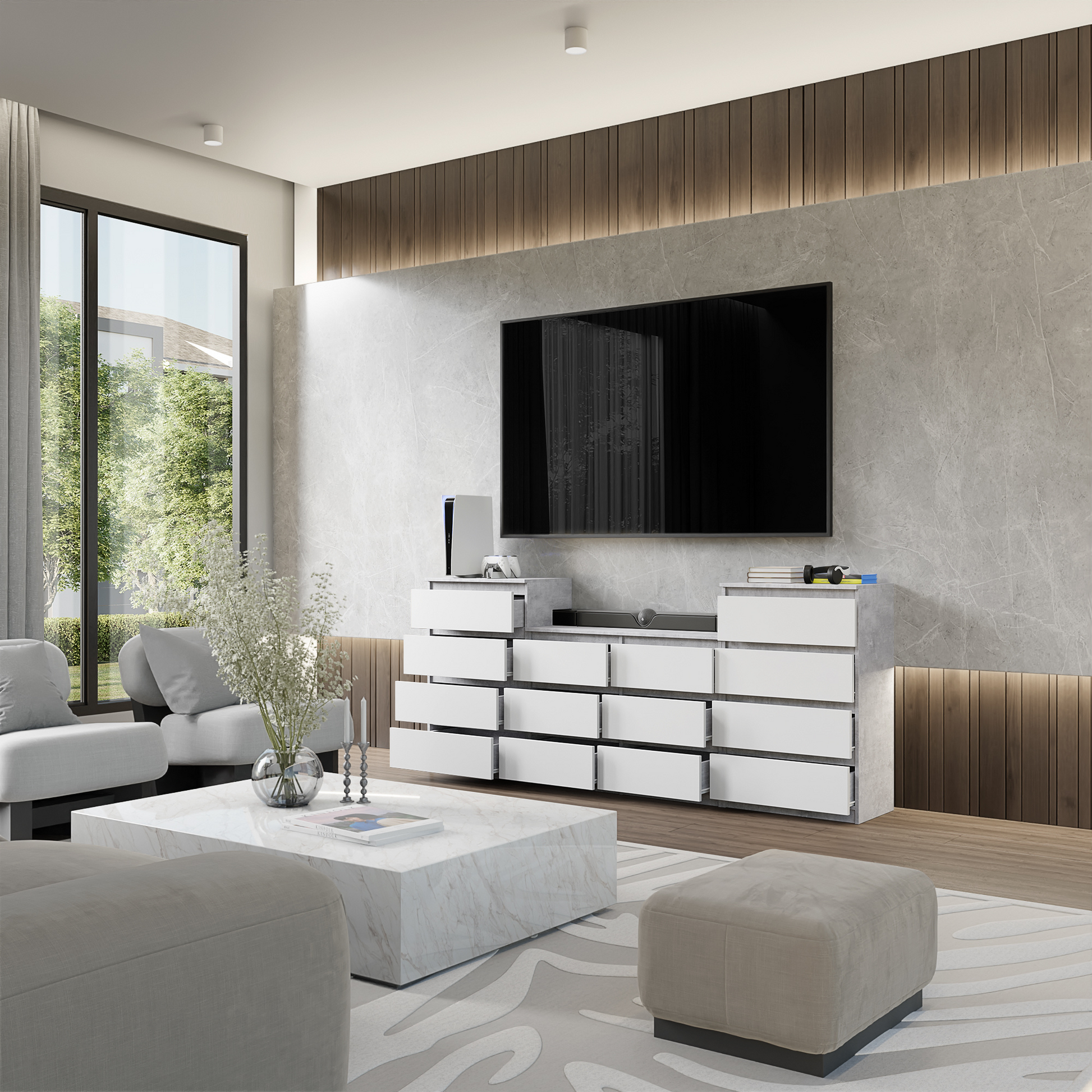GABRIEL - Kommode / Sideboard mit 14 Schubladen (4+6+4) - Beton-Optik / Weiß Matt