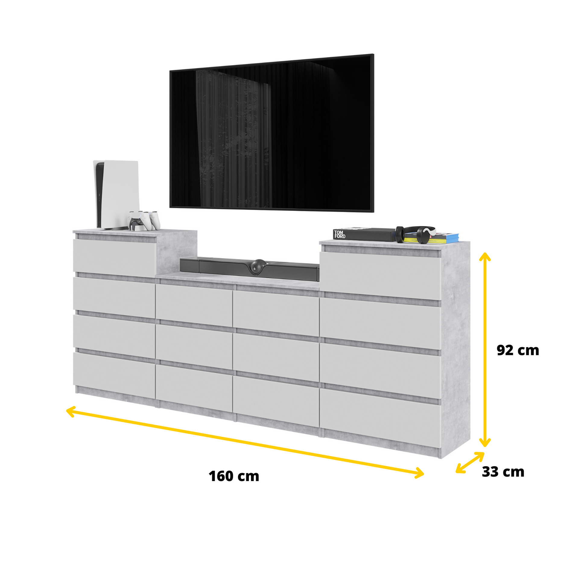 Technische Daten: GABRIEL - Kommode / Sideboard mit 14 Schubladen (4+6+4) - Beton-Optik / Weiß Matt H92/70cm B220cm T33cm