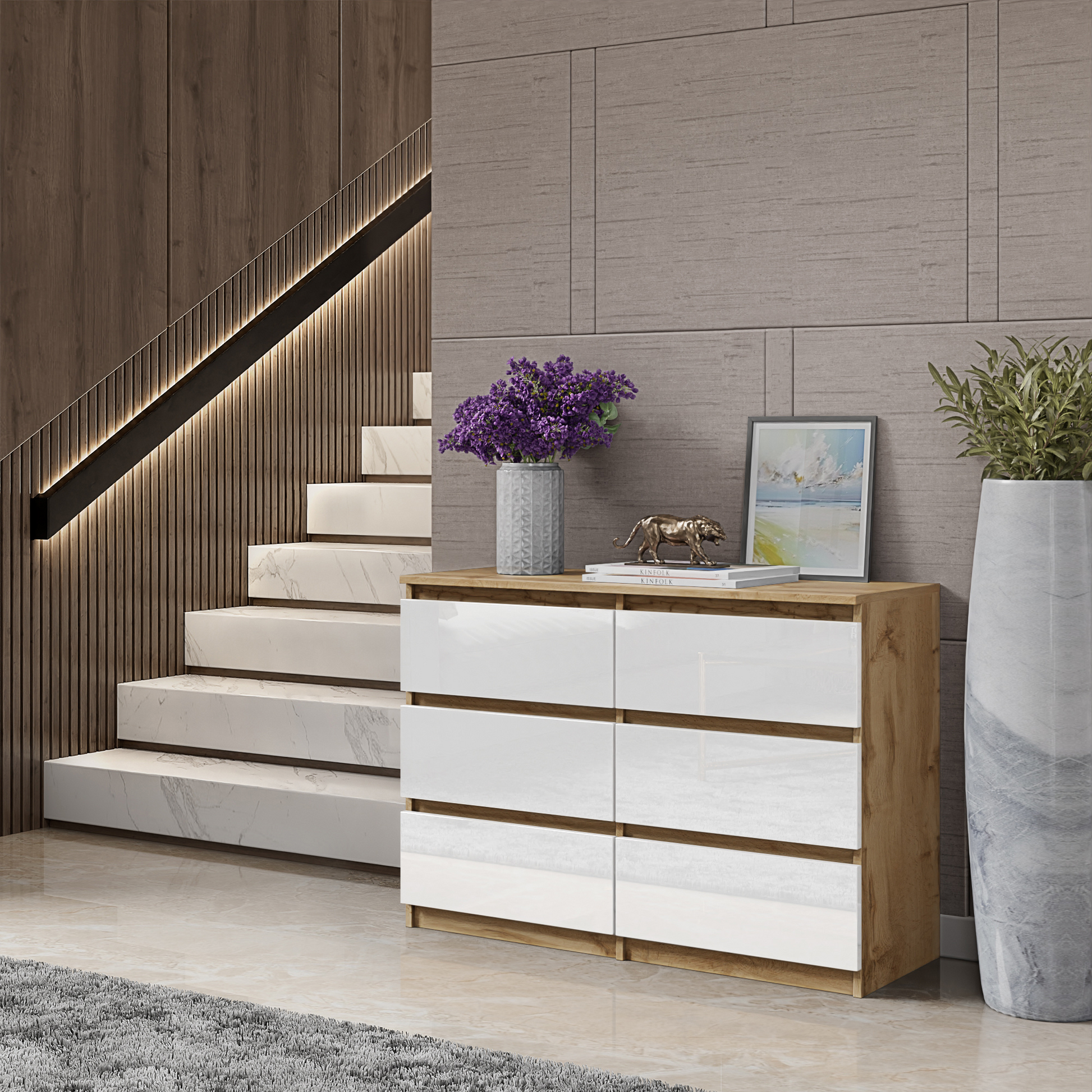 GABRIEL - Kommode / Sideboard mit 6 Schubladen - Wotan Eiche / Weiß Glanz H71cm B100cm T33cm