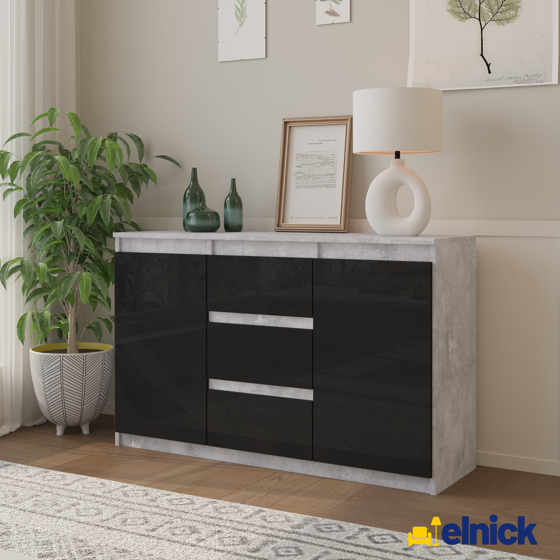 Technische Daten: MIKEL - Kommode / Sideboard mit 3 Schubladen und 2 Türen - Beton-Optik / Schwarz Gloss H75cm B120cm T35cm