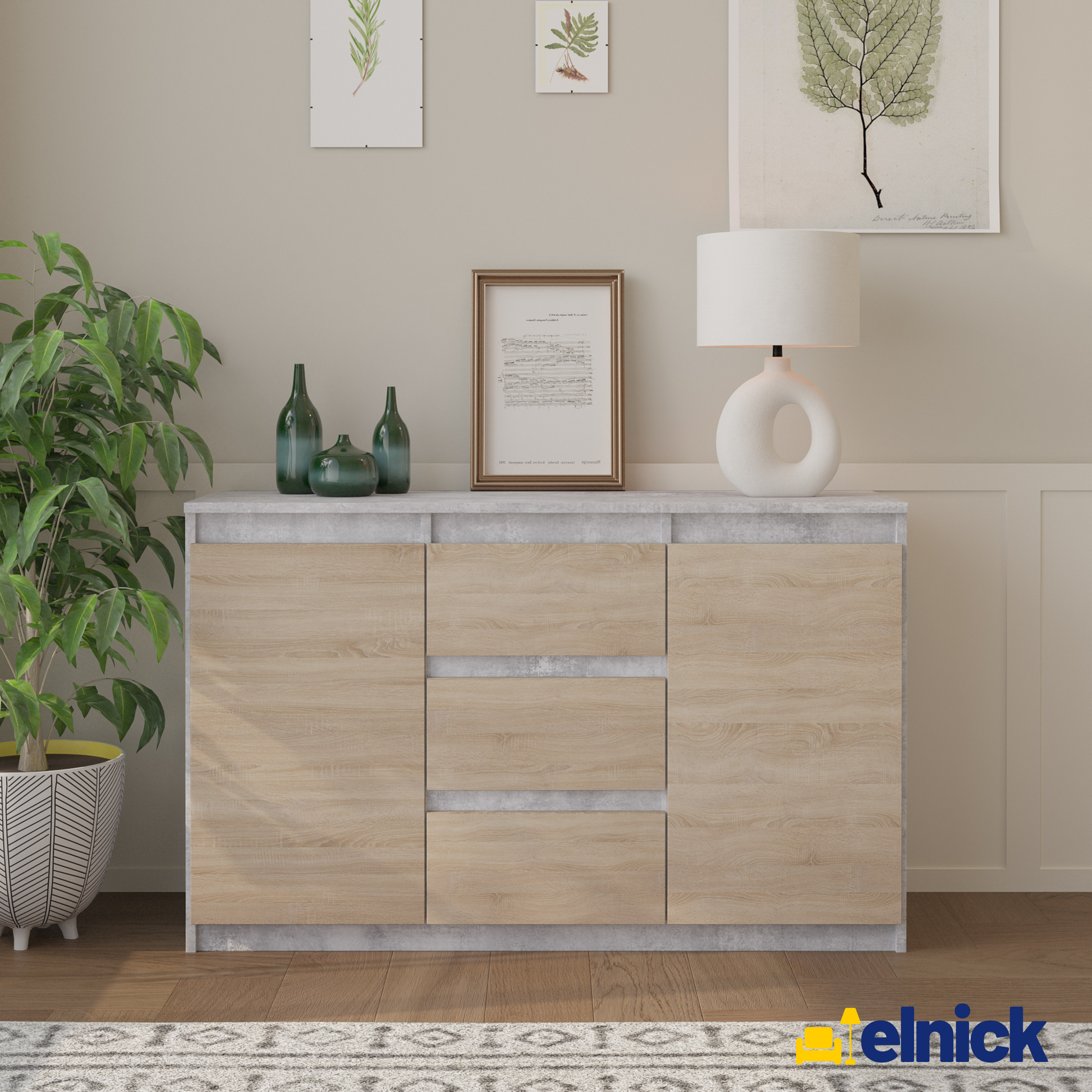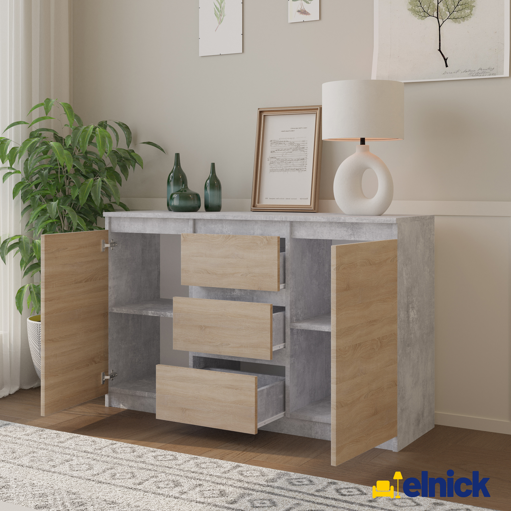 Technische Daten: MIKEL - Kommode / Sideboard mit 3 Schubladen und 2 Türen - Beton-Optik / Sonoma Eiche H75cm B120cm T35cm