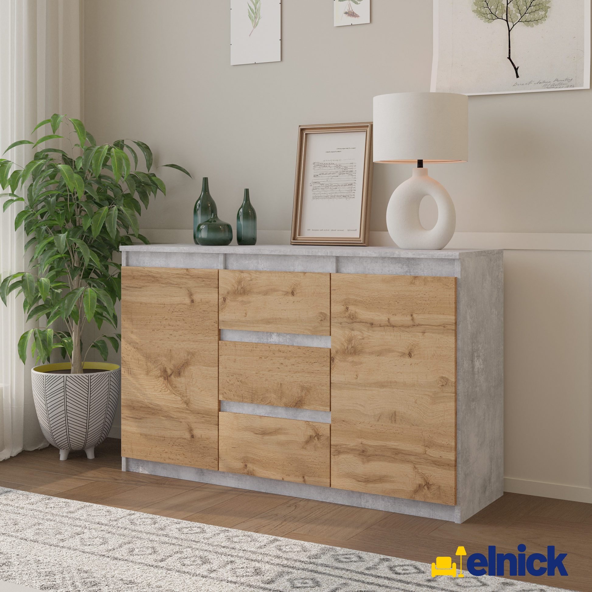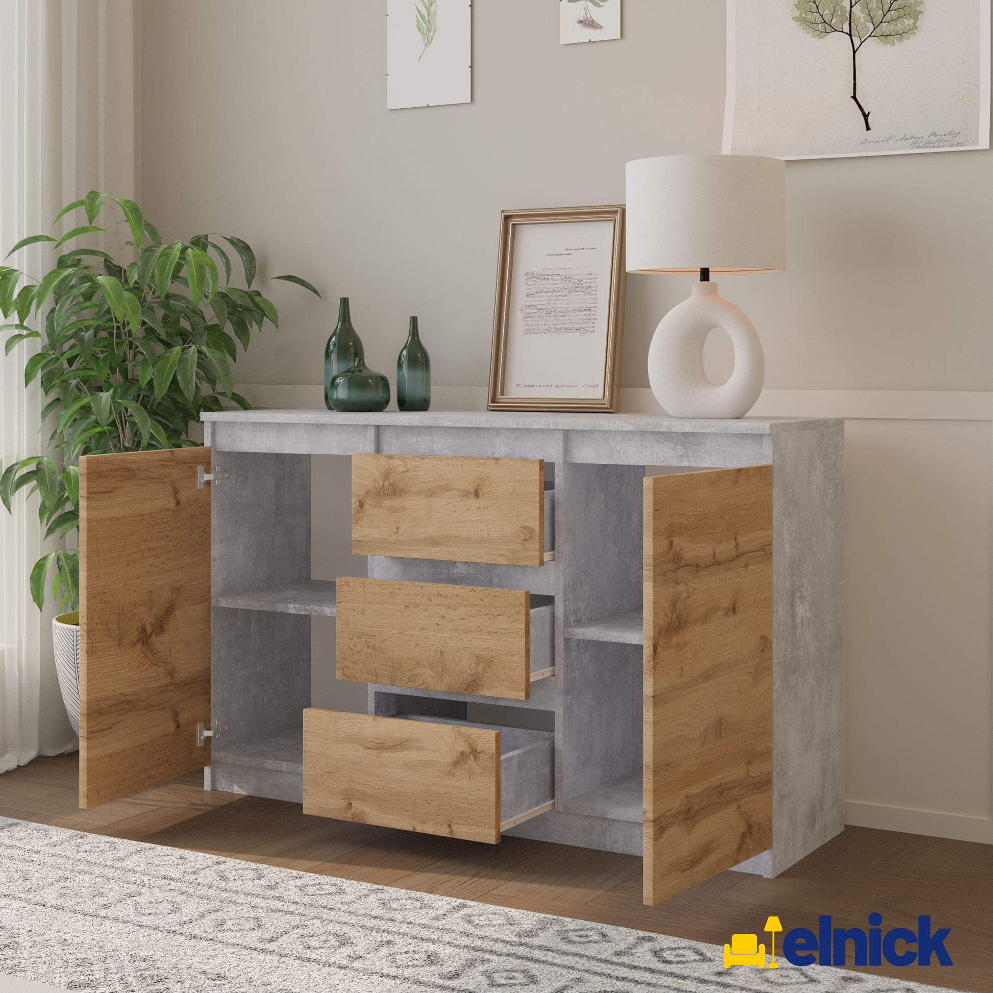 Technische Daten: MIKEL - Kommode / Sideboard mit 3 Schubladen und 2 Türen - Beton-Optik / Wotan Eiche H75cm B120cm T35cm