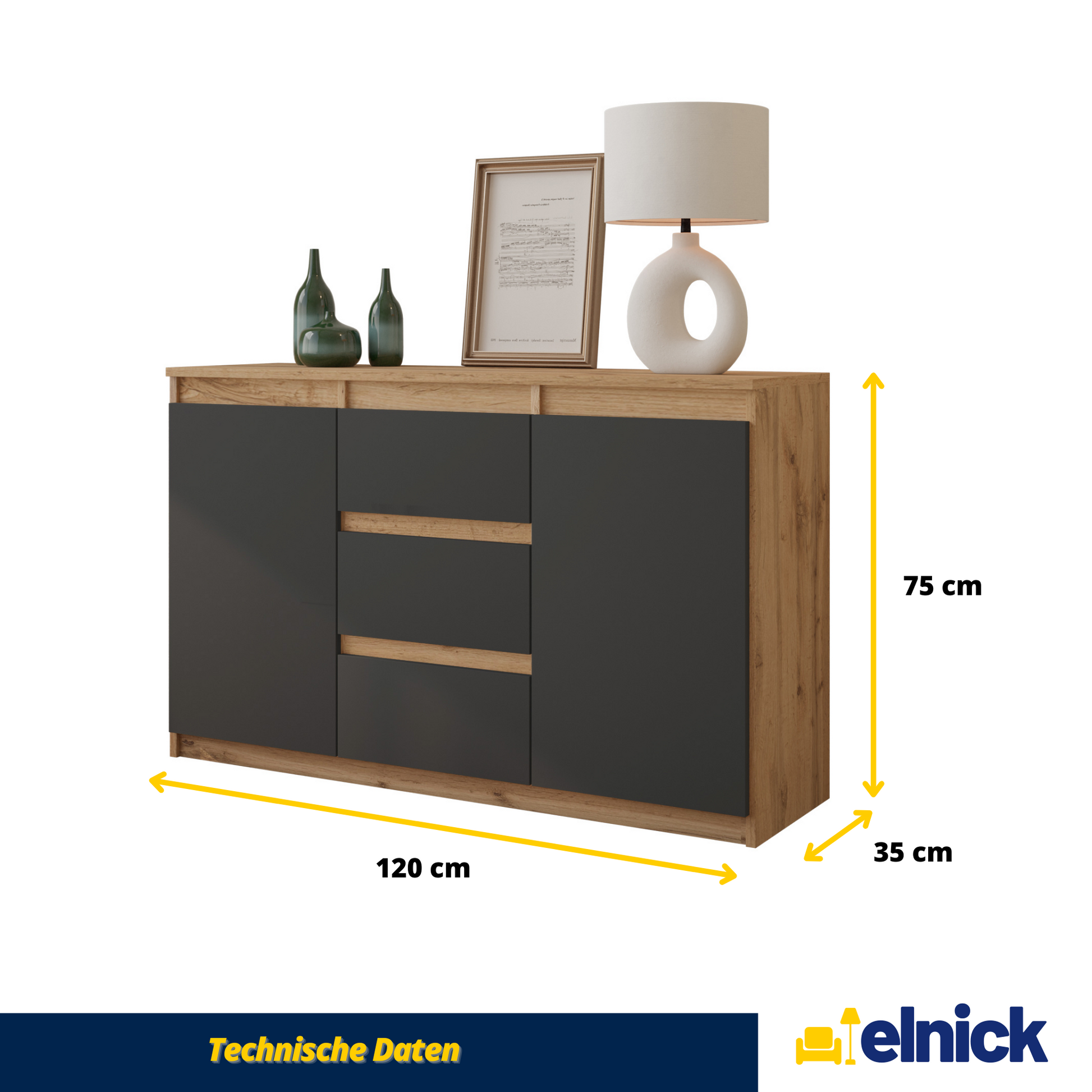 Technische Daten: MIKEL - Kommode / Sideboard mit 3 Schubladen und 2 Türen - Wotan Eiche / Anthrazit Grau H75cm B120cm T35cm