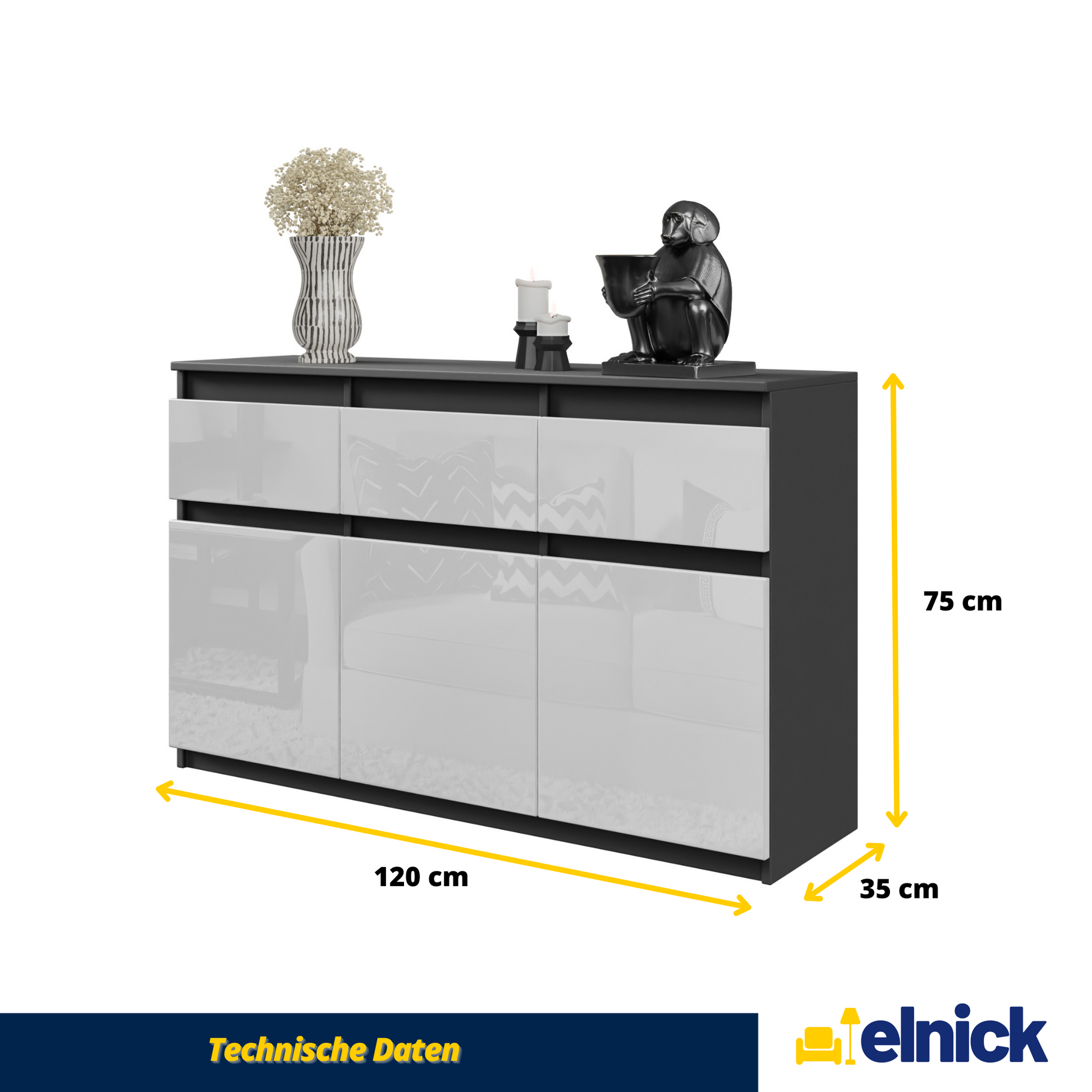 Technische Daten: NOAH - Kommode / Sideboard mit 3 Schubladen und 3 Türen - Anthrazit Grau / Weiß Gloss H75cm B120cm T35cm