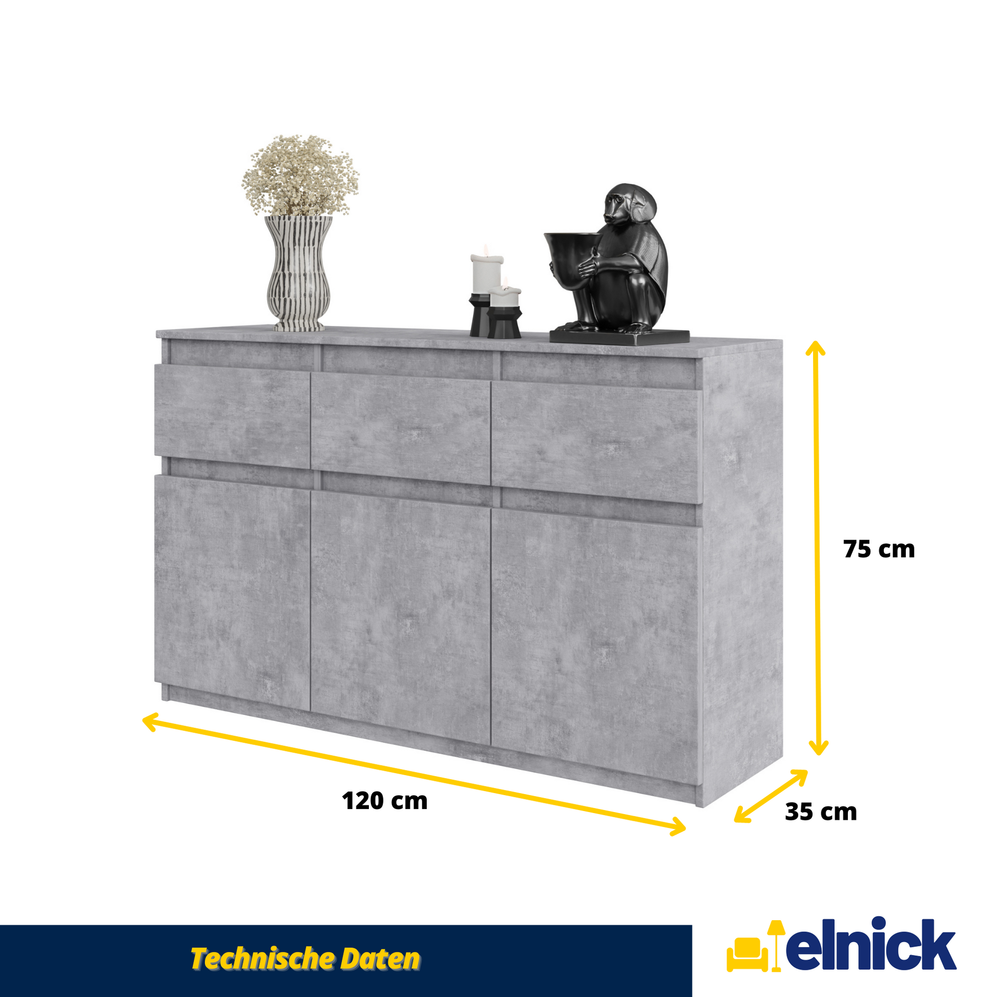 Technische Daten: NOAH - Kommode / Sideboard mit 3 Schubladen und 3 Türen - Beton-Optik H75cm B120cm T35cm