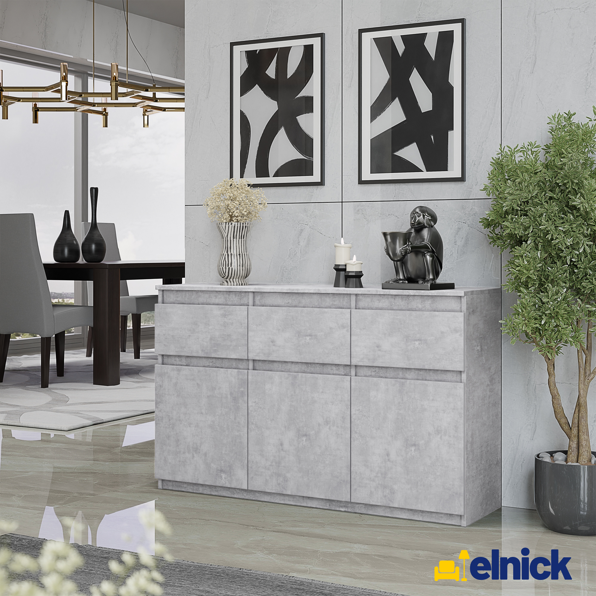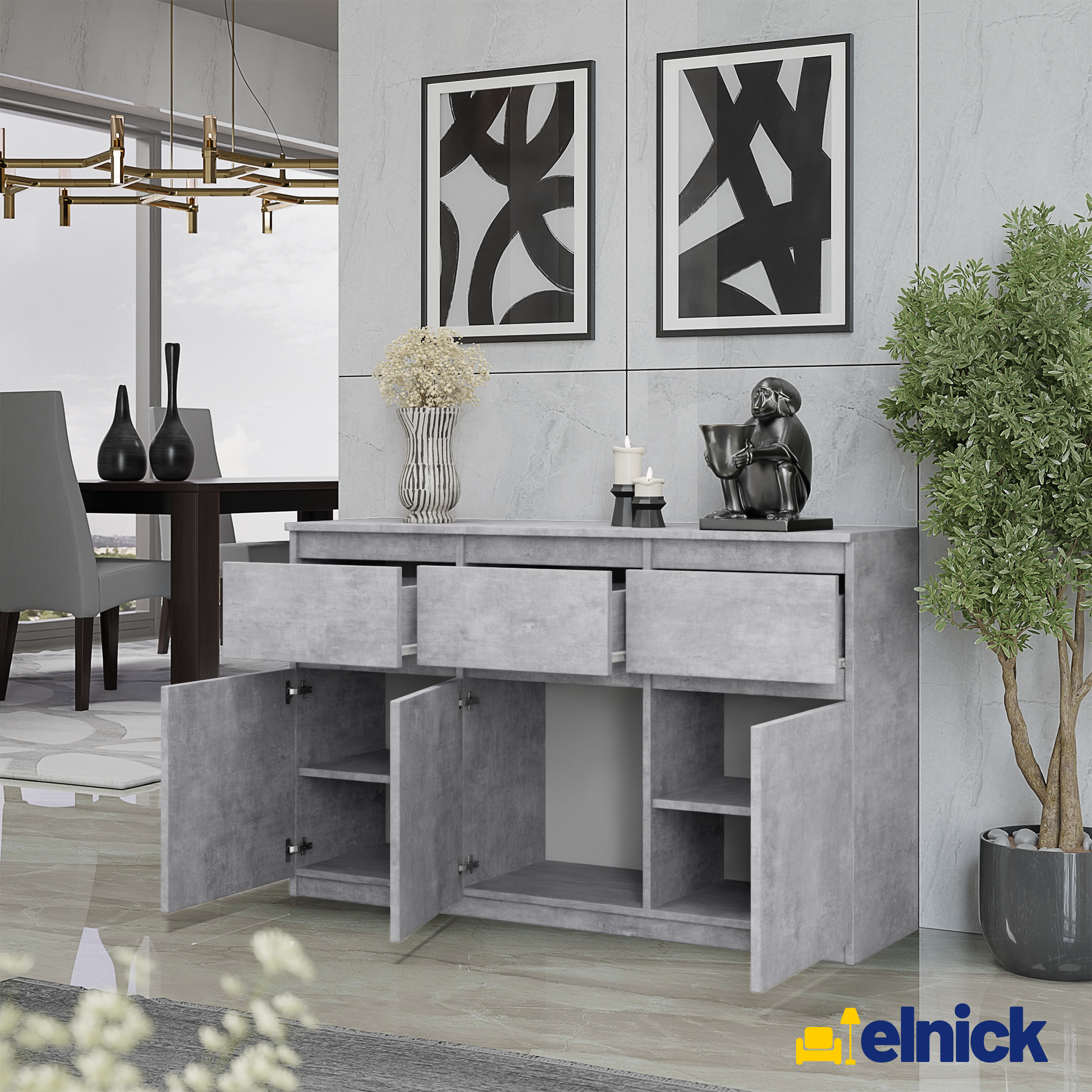 Das moderne Design mit Beton-Optik verleiht dem Sideboard einen zeitgemäßen und stilvollen Look.