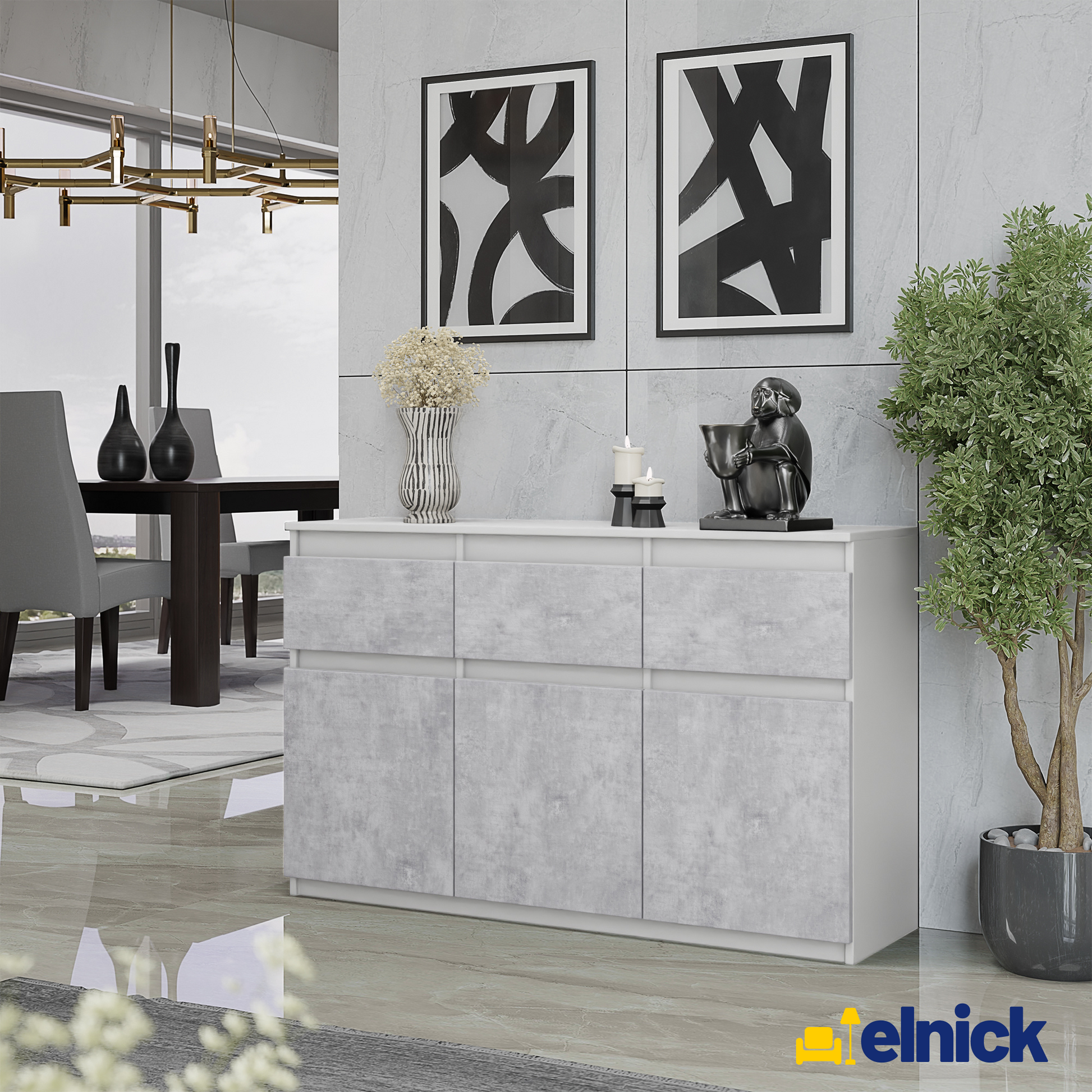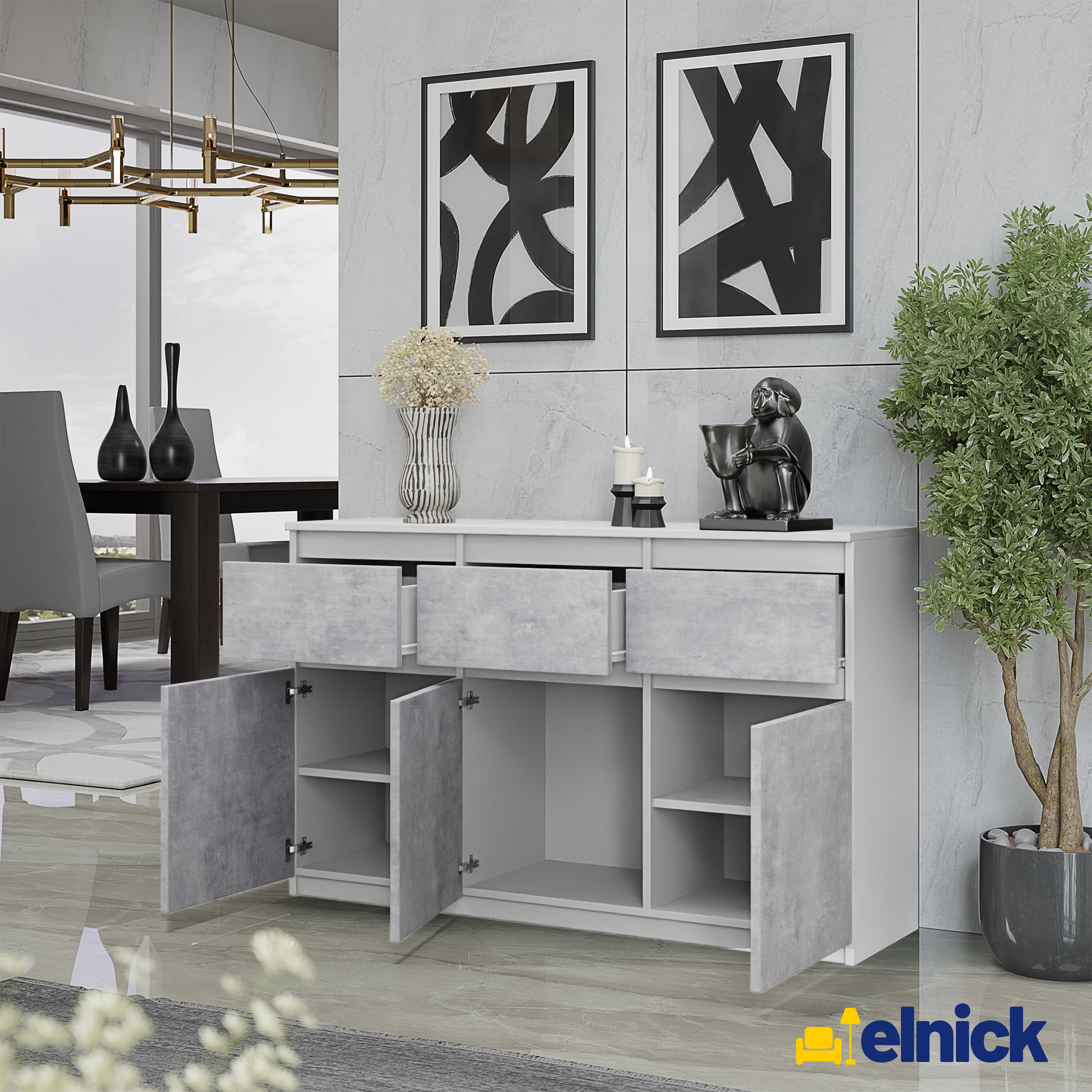 Das klassische Design in Weiß Matt in Kombination mit der Beton-Optik verleiht dem Sideboard einen zeitlosen und vielseitigen Look.