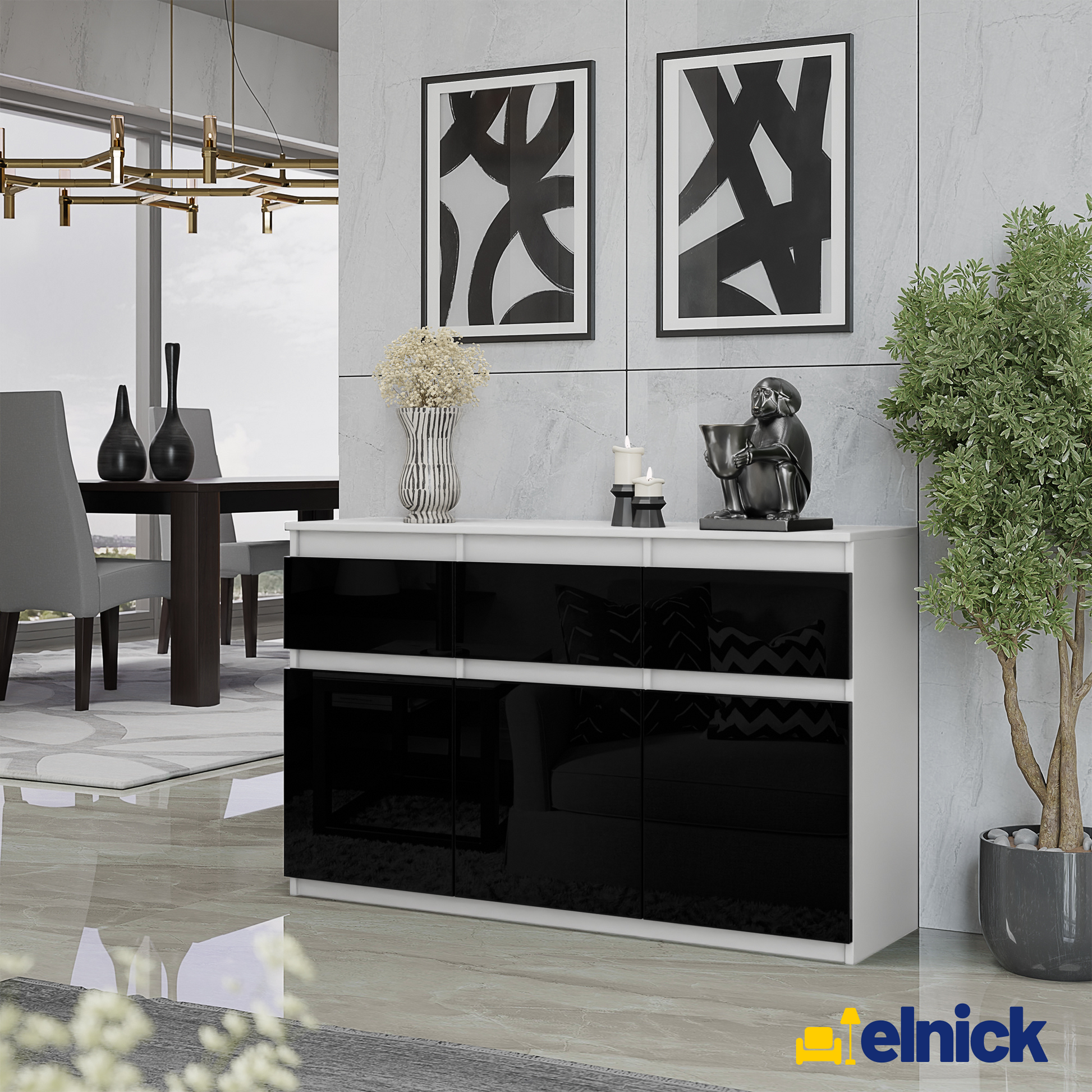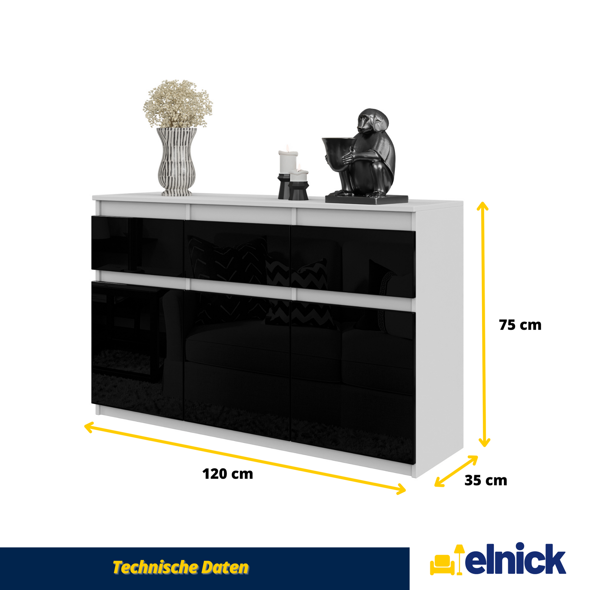 Technische Daten: NOAH - Kommode / Sideboard mit 3 Schubladen und 3 Türen - Weiß Matt / Schwarz Gloss H75cm B120cm T35cm