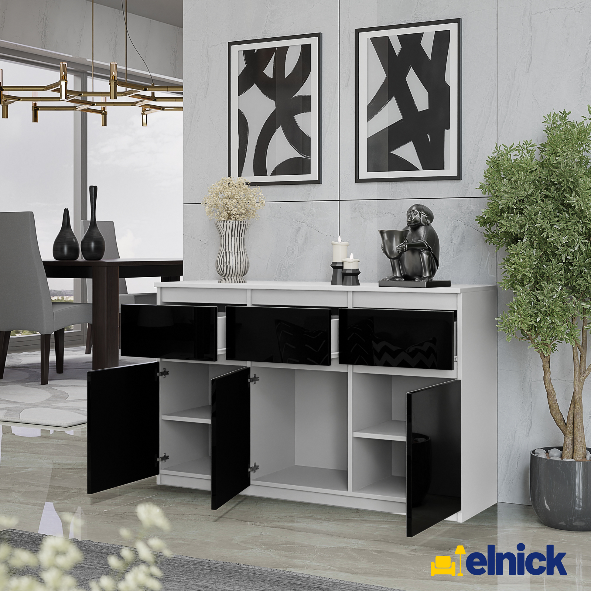 Die Kombination aus Weiß matt und Schwarz glänzend ist zweifellos perfekt und verleiht Ihrem Raum ein elegantes und modernes Erscheinungsbild. Diese Farbkombination ist zeitlos und vielseitig einsetzbar, wodurch sich das Sideboard nahtlos in jede Einrichtung integriert. Egal, ob im Wohnzimmer, Schlafzimmer oder Flur, dieses Möbelstück wird zum Blickfang und zieht die Aufmerksamkeit Ihrer Gäste auf sich.